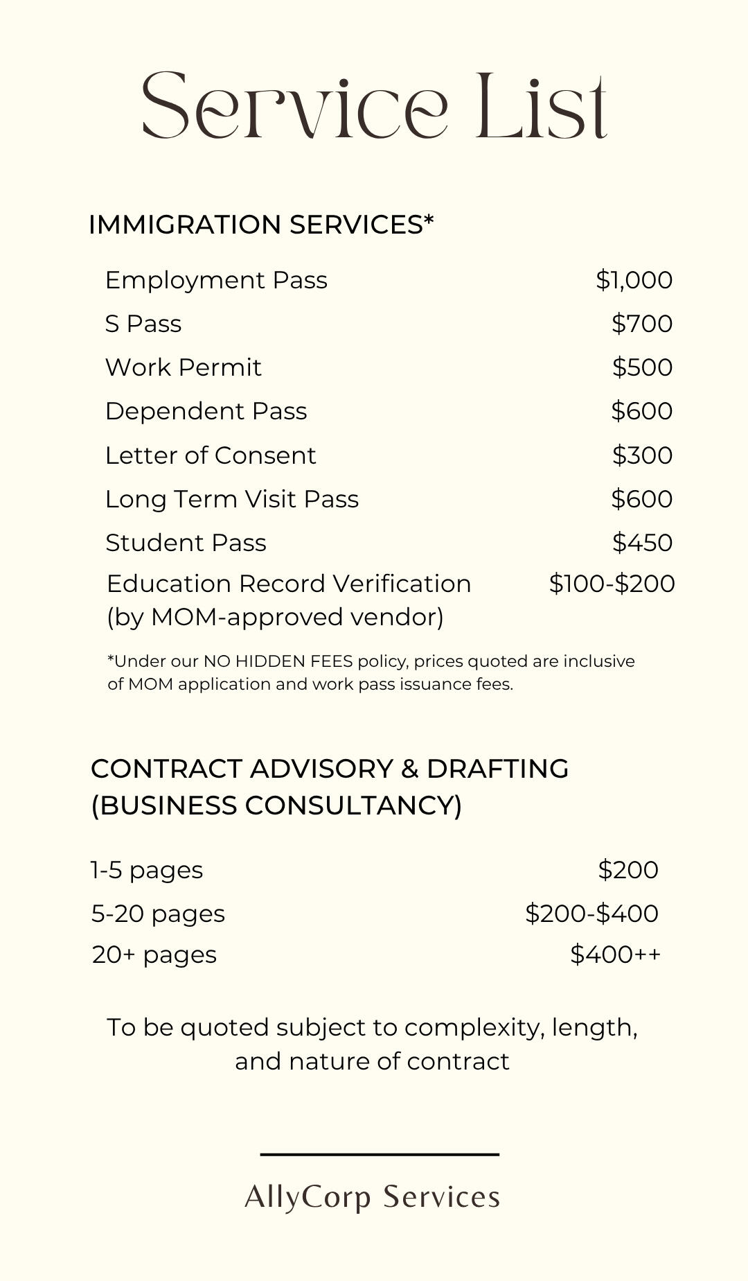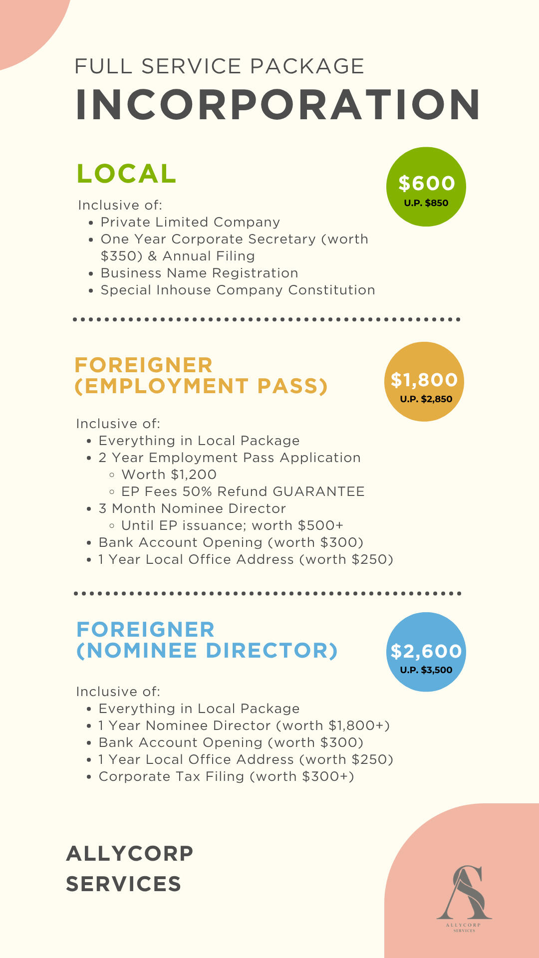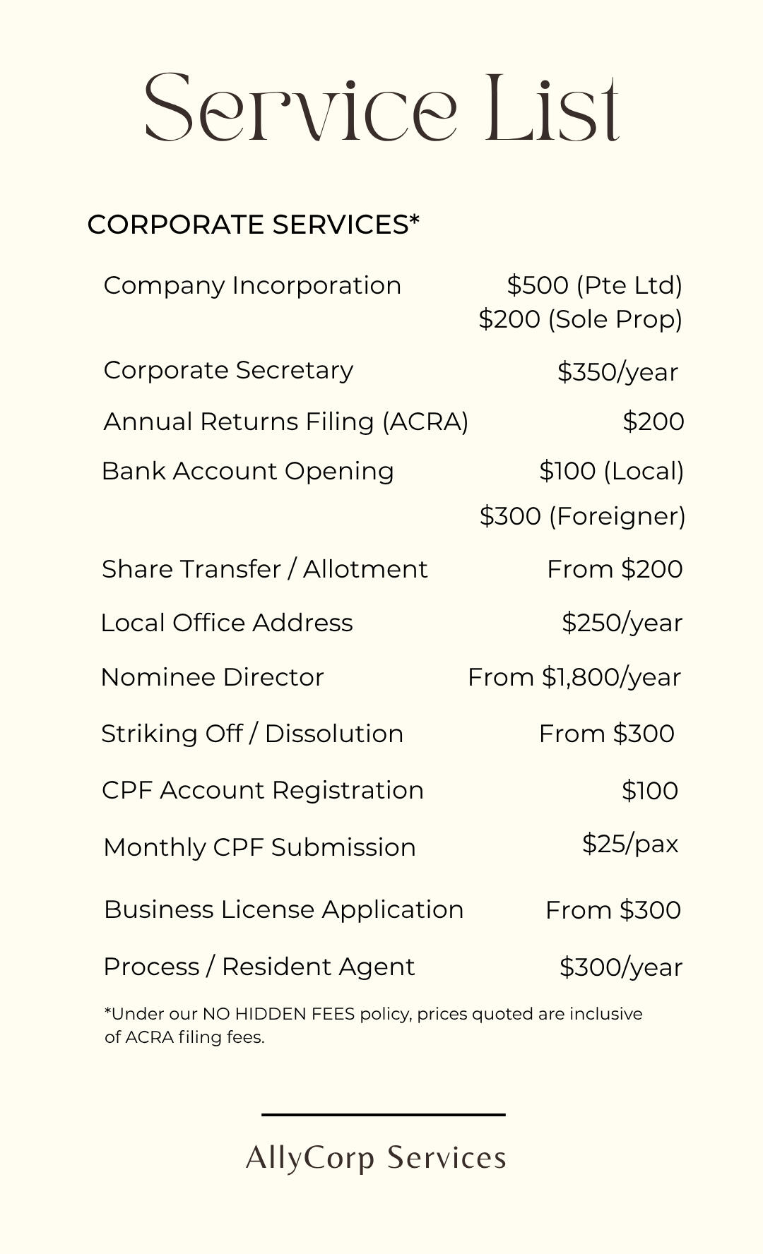 Our mission is to be YOUR TRUSTED ALLY, delivering affordable and reliable corporate administration services tailored for local and foreign entrepreneurs looking to establish their presence in Singapore.P.S. AllyCorp is pronounced as air-lye-corp, rather than alley-corp. :)